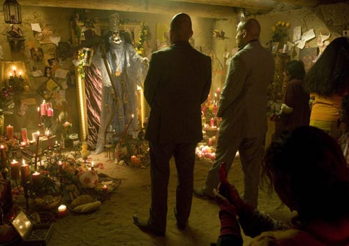 No tardamos en conocer hacia donde se dirigen, que no es otro sitio que una chabola en mitad del desierto plagada de santos, velas y demás material "santero" (pongo santero, pero podria ser de cualquier tipo de brujería, religión..etc, no estoy muy puesto en estos temas). Para nuestra sorpresa, vemos junto a la figura que todos veneran el retrato robot de Walter, también conocido como Heisemberg.